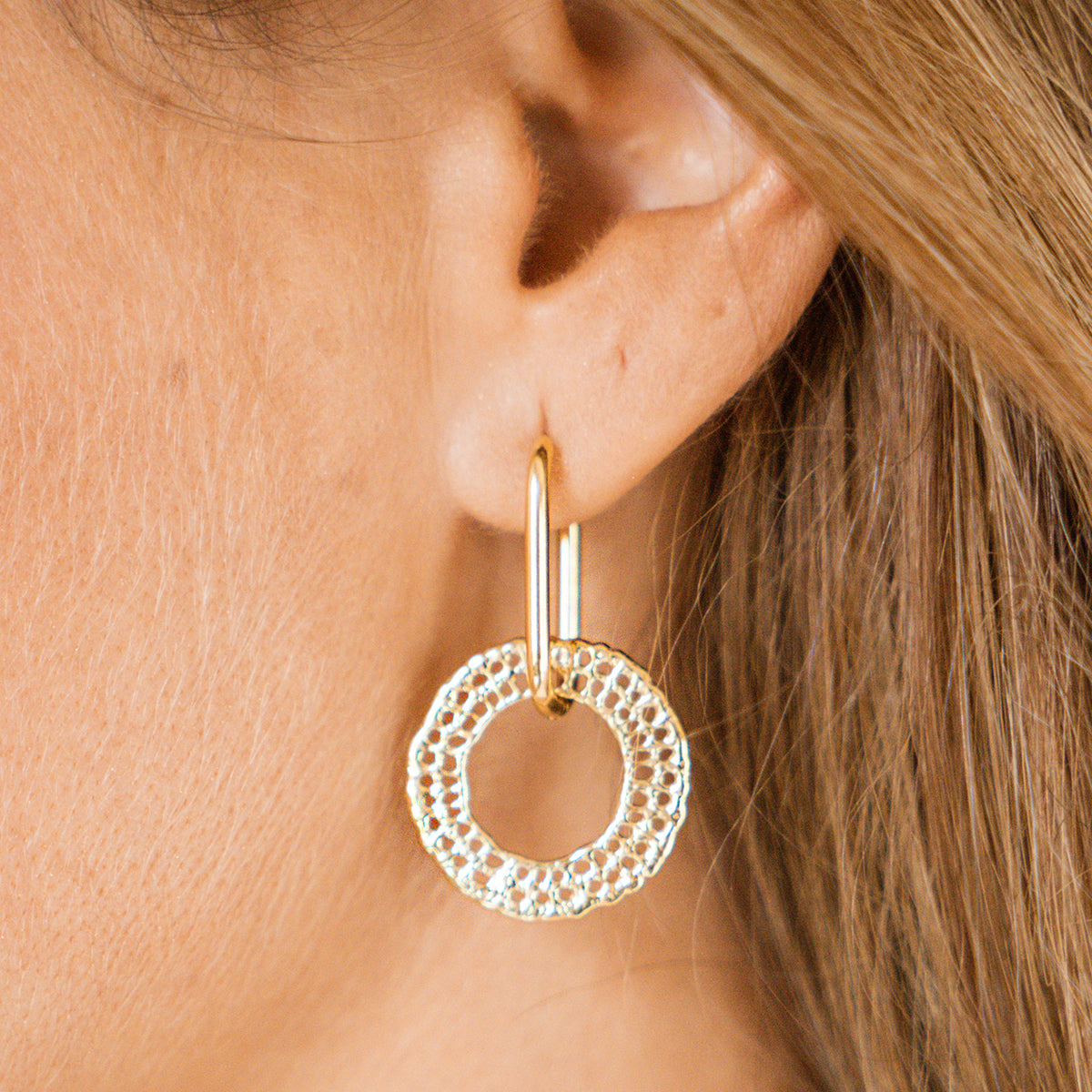 Este pendiente consta de un aro rectangular que tanto se puede usar solo como con el donut calado martillado que es su pieza central.
